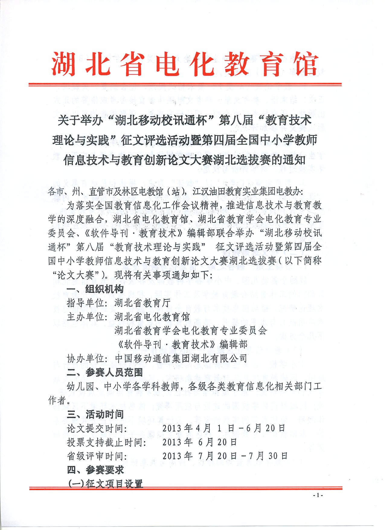 为落实全国教育信息化工作会议精神,推进信息技术与教育教学的深度融合,湖北省电化教育馆、湖北省教育学会电化教育专业委员会、《软件导刊•教育技术》编辑部联合举办第八届“教育技术理论与实践”征文评选活动。为落实这项工作,我县也将启动阳新县2013年“教育技术理论与实践”征文评选活动,现将有关事项通知如下: