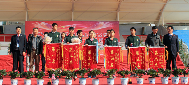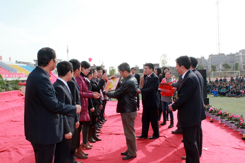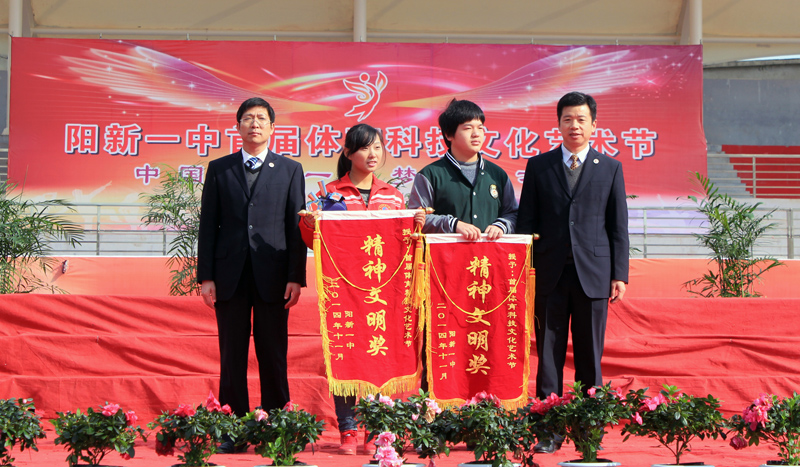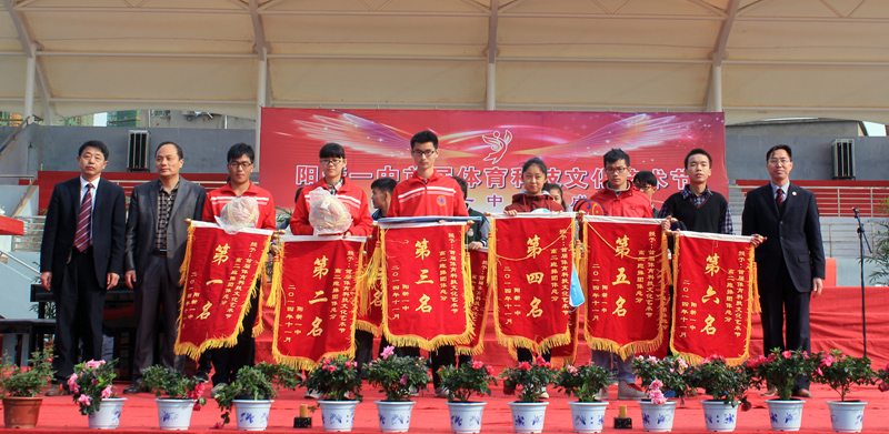 柯友国局长、尹闻杰副局长,明道树校长及阳新一中校领导,赞助单位代表为获奖学生团队和教师团队颁发了奖品。高一、高二年级体育项目竞赛团体总分前六名,跑操比赛前六名班级;男教师篮球赛,女教师乒乓球赛前三名团队;教师大合唱,健美操比赛前三名团队分别上台领奖。