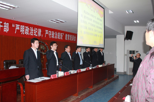 会议伊始,方长风书记便点明了此次会议的主题和流程,随即,全体党员干部肃静起立,举起右手,在李雁鸣主任的领读下重温了入党誓词。随后,副校长潘龙星向全体与会人员简要传达了县里刚结束的副科级以上党员干部“严明政治纪律,严守政治规矩”教育培训会的会议精神。方长风书记宣读了《阳新一中关于在党员干部中开展“严明政治纪律,严守政治规矩”教育培训活动的通知》。