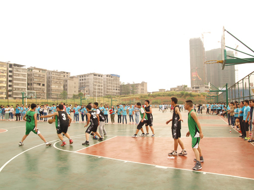 54号上午9时,阳新一中塑胶体育场里的篮球场被统一穿着天蓝色T恤的学生围得水泄不通。人群中间的篮球场里双方队员球技如行云流水潇洒自如,劲头似龙精虎猛豪气冲天。在场所有人的心口都跟着篮球上下跳动,所有人的目光都随着篮球左右翻飞。抢篮、运球、妙传、挡拆、转身、跳投,皮球应声入网!四周围观的师生加油声、尖叫声、欢呼声、口哨声震耳欲聋,响彻云霄。