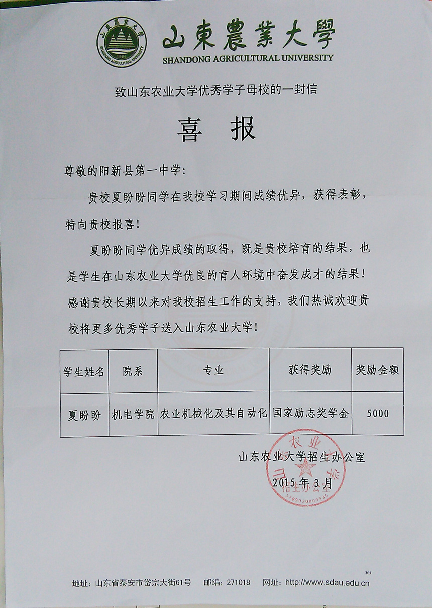 山东农业大学发来阳新一中校友——夏盼盼的喜报