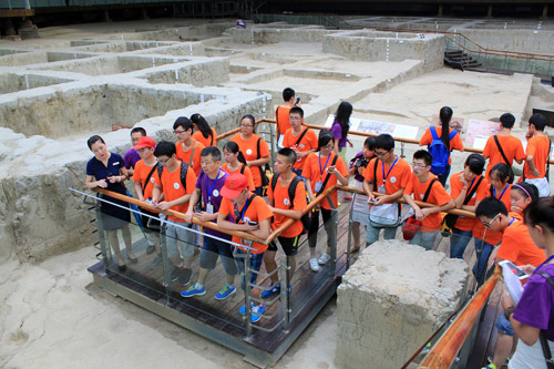 本次参观一共分为三个部分。首先参观遗址馆,遗迹馆展现的是文物挖掘现场及祭祀场所,在这里,营员们可以近距离实地观看考古发掘的过程,感受古蜀国祭祀活动的频繁和宏大气派。其次是参观陈列馆,陈列馆由“远古家园、王都留影、天地不绝、千载遗珍、解读金沙”五个展厅组成。这里集中展现了金沙时期古蜀先民们生活中使用的一些器物,以及生活场景。其中第一展厅“远古家园” 则根据考古发现的遗迹,运用现代科技还原出古蜀先民生活的实景图,被不少营员们称赞为“世外桃源般的生活图”。最后,营员们还观看了时长为15分钟的4D电影《梦回金沙》,电影里展示了远古时代蜀地的自然、人文环境和状态。