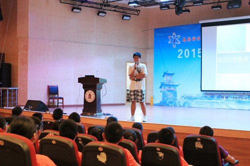 晚上,“优秀大学生交流会”在文华活动中心举办。交流会上,三位来自川大的优秀大学生与小营员们愉快地分享了自己的大学生活,他们幽默诙谐的演讲不时博得在场师生的阵阵笑声。