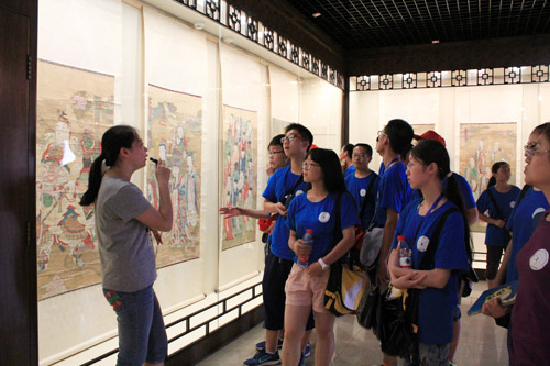 为了让营员们更加深入的了解四川大学这所百年老校悠久的历史文化底蕴,川大还安排营员们参观了四川大学博物馆。讲解员带领着营员们从负一楼的石刻艺术陈列馆开始参观,在这里营员们看到了浪漫与写实结合的汉唐石刻艺术。唐代龙兴寺佛教石刻造像群,栩栩如生的石刻艺术让人叹为观止。一楼的民俗学陈列馆里展出的是妩媚流丽的清末民国民俗文物,含婚、艺、书、影4个主题。展厅里陈列的展品都距离营员们现在生活太远,每个人都仔细聆听讲解员的解说,驻足欣赏每一件展品。二楼是民族学陈列馆,展厅里摆放着充满浓情奔放的西南民族风物。尤以四川藏区文物为重点,这些藏族服饰、器具引起了来自宁夏和青海的藏族营员们的民族归属感和自豪感。最后来到的是古代瓷器厅和古代服饰艺术厅,在这里营员们看到了宋元明清名窑精品和清代至民国服饰艺术,都深深的为古人们精湛的手工艺术折服。