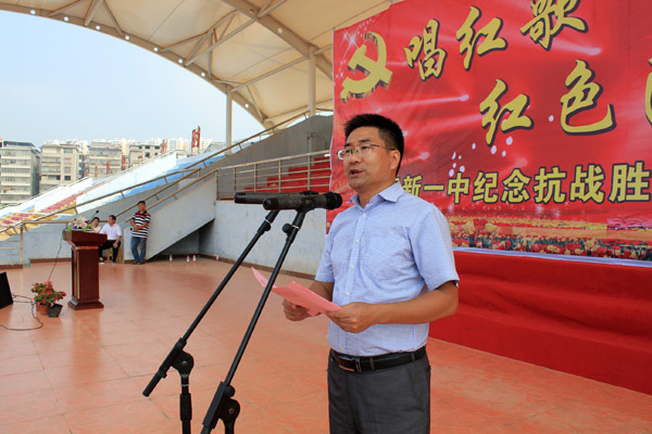 见一中师生此情盛景,教育局柯友国局长也上台作了总结发言,柯局长说,一中师生以红歌会的形式来纪念中国人民抗日战争胜利70周年并举行新学年开学典礼,形式新颖,别开生面,意义重大,很有必要。近一年以来,一中在校园环境、教学管理、教育条件,师生面貌等方面发生了许多可喜的变化,在全县较为出色地起到了示范引领作用,希望一中全体师生珍惜环境、珍惜岗位、珍惜荣誉,再接再厉,努力拼搏,让一中的教育教学质量再上新台阶,让我们以优异的成绩搬进教育城,让我们以百倍信心迎接一中更加美好的未来!