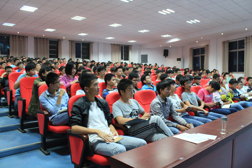 11月16日晚上7:00,阳新一中能容纳380多人的学术报告厅座无虚席,这里,阳新一中物理教师朱建华正在给同学们作“三小”创作(小发明、小制作和科技小论文)指导讲座。