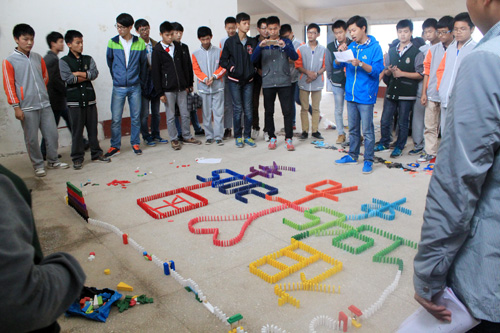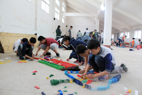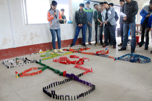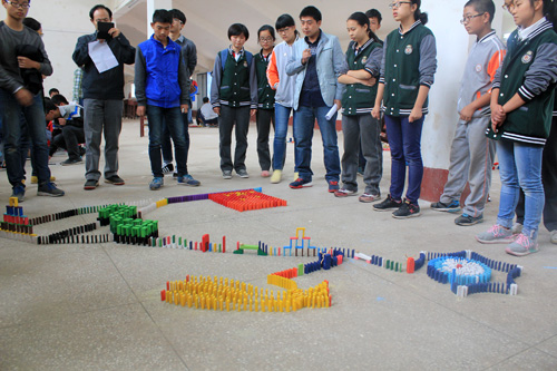 多米诺骨牌发源于中国,在欧美社会中则蔚为流行,是一种综合德智体美劳的运动,可以培养当代中小学生的团队协作能力,考验学生体力、耐心、意志力和临场应变能力,提高学生的动手能力。多米诺骨牌比赛也是我校首次引入艺术节科技项目内容,1019日(周一)晚上,柯贤根老师对每个年级选派的两支队伍进行相关培训。正式比赛于1030日上午1000在新运动场体育室内举行,明道树校长、柯美宝副校长、陈绪义主任到场观看。经过紧张、激烈、漫长的比赛过程,评委从骨牌倒塌情况、图案设计和寓意解说等几个方面进行打分,依据平均分高低依次决出第一名高二(20)班,并列第二名高一(20)班、高一(19)班,第四名体育创新班,第五名高三②组,第六名高二(18)班,第七名高三①组,第八名课改实验班。