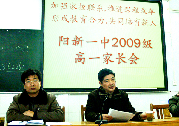 1212下午,阳新一中2009级高一召开全校学生家长会议,会议主会场设在教学楼二楼电教室,其他教室内的学生、家长通过校园广播系统进行同步收听。本次家长会的主题是“加强家校联系,推进课程改革;形成教育合力,共同培育新人”,旨在让学生家长了解新课改,支持新课改,同时向他们汇报我校在新课改中采取的方法、措施和取得的成果。会议由年级主任陈绪全主持,年级负责人、一中副校长、副书记明道树向家长们汇报了这学期来的年级工作情况,宣读了新课改的有关政策,为了孩子的未来,他还向家长们提出了一些具体要求。