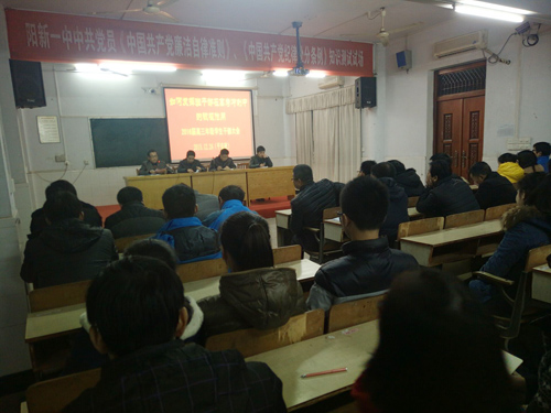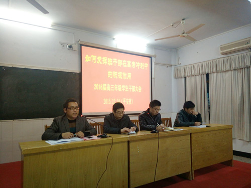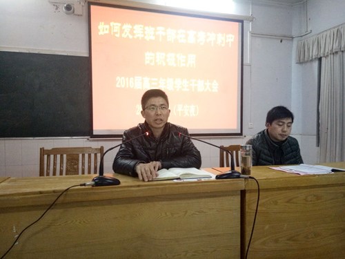 1224晚,正值2015年的“平安夜”。晚上七点整,我校教学楼二楼电教室座无虚席,前面显示屏上赫然写着“如何发挥班干部在高考冲刺中的积极作用”字样,顾名思义,这里正在召开我校2016届高三年级全体班干部会议。