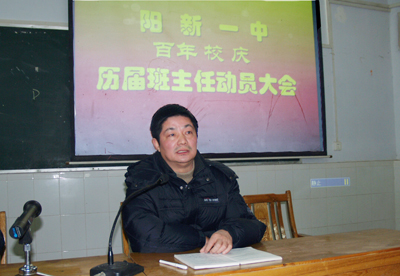 最后,一中校长、党总支书记赵立中作重要讲话。他说,举办校庆意义重大,是对阳新教育历史的回顾,是对过去经验的总结,可以承前启后,继承和发扬优良传统,为以后教育的健康发展打基础。我校举办百年校庆已经得到了县委、县政府的支持,得到了大批校友的支持,绝大多数校友赞同在现校区举办校庆。目前我校为校庆也做了一些工作,成立了校庆专班,校庆专班将每半月出一期简报,每月有工作安排表。班主任们要热情支持校庆的有关工作,加强校友联系,提供有关信息,积极撰写回忆录,参与校庆文集的编写。学校将计划进一步做好以下几件事情:争取县委县政府的支持;争取老校长的理解与支持;争取新老校区校友的沟通与支持;争取社会各界人士的支持;做好各项准备工作。班主任们一定带头行动起来,继承和发扬阳新一中的优良传统,讲团结、讲和谐,把我们一中这件百年大事办好。