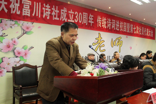 会议由富川诗社秘书长龚正仁主持。首先是代表东道主发言的阳新一中党总支委员、纪检组长方长风致欢迎辞。方长风表达了承办方的热情和坦诚,全面介绍了阳新一中近年来在校园文化建设方面的举措和成就,阐明了传统诗词进校园的现实意义和深远影响。真情祝贺富川诗社三十年光辉历程,感谢诗社对阳新一中文化建设的支持。