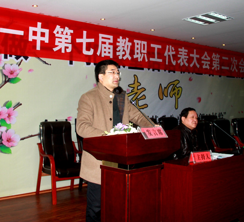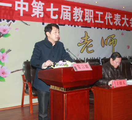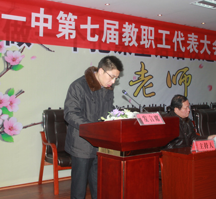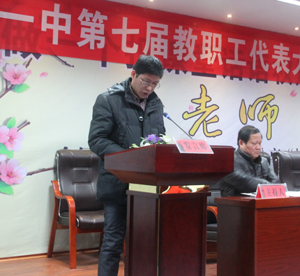 明校长为全体代表作了“适应新常态,管理新举措,提升新形象,共克时艰,共圆一中梦”的主题报告。明校长在报告中,从党建引领,师德为先,积极适应新常态;理念引领,名师领航,教学迈上新台阶;以生为本,全程育人,探索德育新举措;文化强校,亮点突出,校园文化新特色;阳光校园,关爱学子,学生资助新突破;多方筹措,开源节流,办学环境新优化等六个方面对我校一年来改革与发展状况作了全面、细致的回顾和总结,同时,向代表们深入阐述了我校面临的机遇和挑战,希望大家在正视挑战的同时,也应清楚看到挑战中存在的机遇。最后,明校长向代表们明确了2016年的工作思路,希望大家共克时艰,为共圆“市内起示范,省内有地位,省外有影响”的“一中梦”而努力奋斗!明校长的报告获得全场掌声!