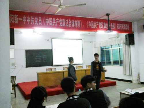 45日晚,高二(1)班同学在教学楼二楼电教室展示了一堂以“守常规,养习惯,树形象”为主题的班会课,班会主题突出,形式新颖,学生表现活跃,获得了与会领导、班主任的一致好评。