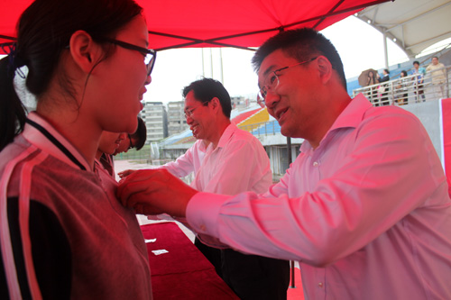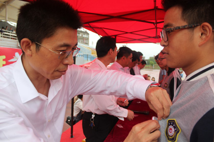 上午930,成人礼仪式正式在雄壮威武的国歌声中开始。阳新一中工会主席、高三年级主管领导肖绪曙主持会议。紧接着,学校领导和家长为孩子佩戴成人徽章。当父母不再年轻甚至笨拙的双手为孩子戴上徽章时,很多学生留下了幸福、激动泪水。