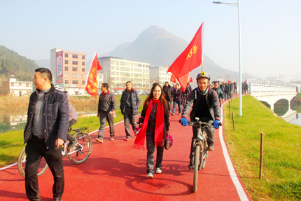 参观完新一中,9:20左右,大家再次登上大巴车,向乡博园出发。乡博园位于三溪镇,驱车约四十分钟,上午10:00左右我们到达目的地。此时虽是隆冬时节,但天朗气清,惠风和畅,“不似春光,胜似春光”。大家沐浴在冬日暖阳下,徜徉在青山绿水之间,放松心情,好不惬意。这时,阳新一中自行车骑行队,也进入了乡博园。骑行队员们,意气风发,鲜红的骑行队旗帜,迎风招展,为乡博园增添了一抹亮丽的色彩。