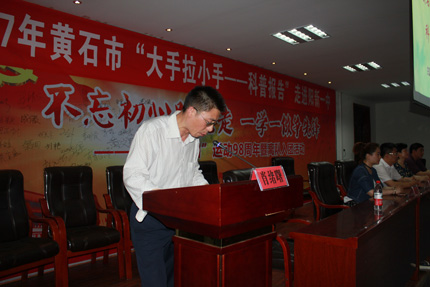 县科协主席徐美芳(前排右一)、阳新一中校长明道树(前排右二)等领导在现场聆听报告 |