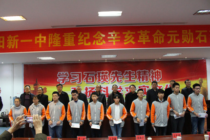 演讲比赛将此次纪念石瑛先生活动推向了高潮,石瑛先生石瑛先生嫡孙、省政府参事室参事、大鹏实业有限公司董事长石聿新动情地表达了他内心的感谢和感动,并对大家提出希望,希望大家秉承石瑛先生爱国爱民、尊师重教的精神,努力拼搏,为家乡为祖国做出更大的贡献。石瑛先生嫡孙石聿新先生为高三年级优秀学生颁发石瑛奖学金5万元。