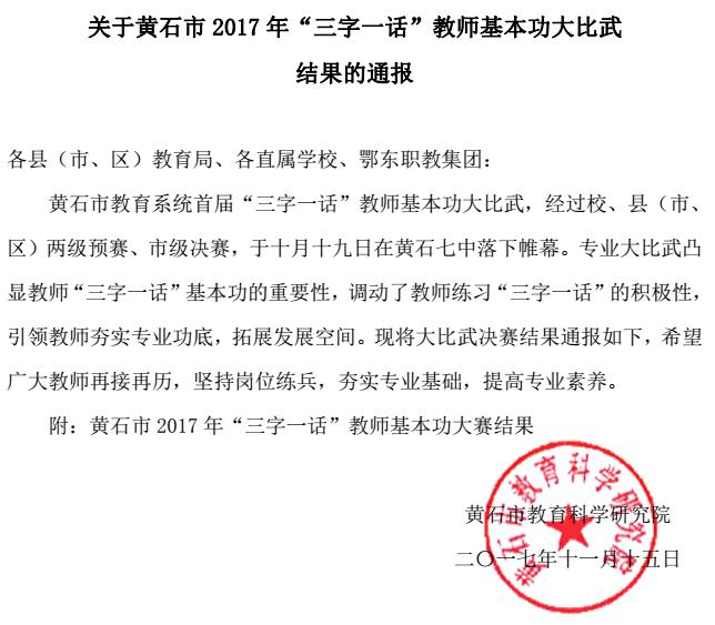 关于黄石市2017年“三字一话”教师基本功大比武