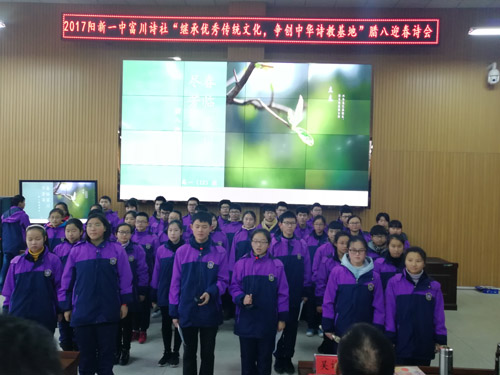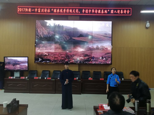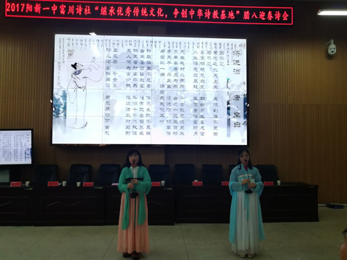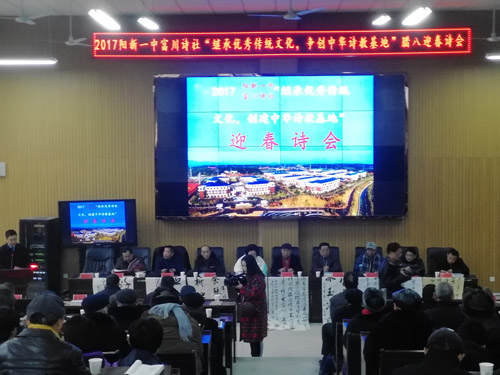 2018年元月24,临冬梅酷寒之际,教育城却迎来了诗意盎然的腊八节。群英荟萃,富川诗会。阳新一中新校区明德楼阶梯教室,举行了一场以“继承优秀传统文化,争创中华诗教基地”为主题的腊八迎春诗会。这既是富川诗社的一次难得盛会,也是阳新一中举办的一次“传统诗词进校园”的重大活动。对于这次盛会,政界领导和文化界名士悉数到场。出席这次盛会的领导有黄石市人大常委会原副主任、西塞山诗社社长李声高先生,黄石市林业局原副局长、西塞山诗社常务副社长江祖桢先生,湖北师范大学文学院教授黄群建先生,县常委、宣传部卢素琴,县宣传部副部长向能来、陈前波,县文联主席叶祥东,县政协原副主席蔡定扬,富川诗社原社长龚正仁,阳新一中校长明道树等,参加盛会的合作单位有大冶市诗词楹联学会、铁山区鹿獐山诗社、大冶华夏重儒诗社、瑞昌市诗词楹联学会等。