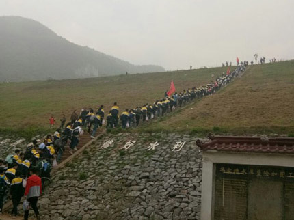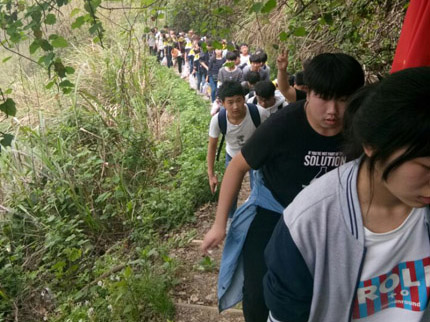 这是一次磨炼之旅。从早八点出发,到下午将近四点返回,历经近八个小时。从登山,到返程,行程约三十公里。有的同学鞋磨破了,有的腿走痛了,甚至有的同学腿抽筋了,有的同学脚崴了,有的同学胸闷(马一同学第一次登父子山因胸闷而中途放弃)……没有任何因素能阻止,552名同学全部登顶。