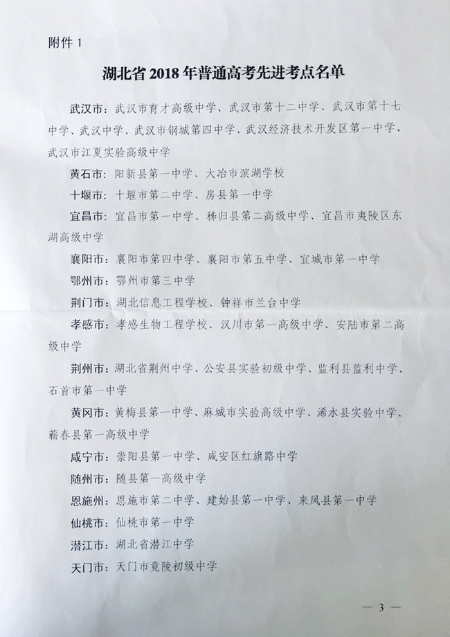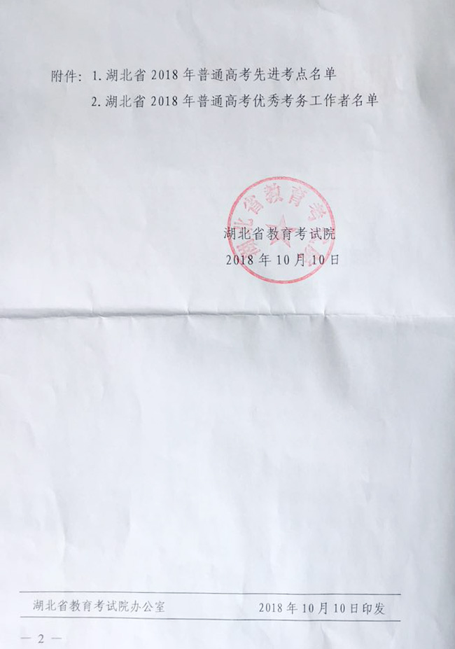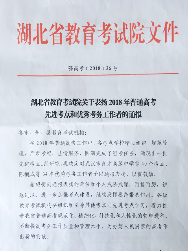 1010日,湖北省教育考试院印发了《湖北省教育考试院关于表扬2018年普通高考先进考点和优秀考务工作者的通报》,我校被评为湖北省2018年普通高考先进考点。