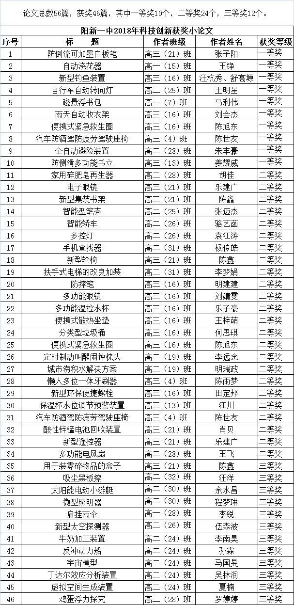 “三小”(小发明、小制作、科技小论文)创作是体育科技文化艺术节的重要内容之一,旨在激发学生爱科学、学科学、用科学的兴趣,培养学生的创新精神和实践能力。11月23日晚上7:30,学校在学校新校区至善楼组织专家对本次体育科技文化艺术节收集的科技创新作品进行了评选。论文总数56篇,获奖46篇,其中一等奖10个,二等奖24个,三等奖12个。科技小制作、小发明类产生一等奖2名、 二等奖4名。现将结果公布如下: