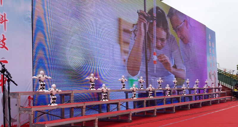 1、机器人节目表演。在艺术节开幕式中,阳新一中机器人设计与制作社团把机器人群体搬上舞台,伴随着优雅的音乐,20个机器人在舞台上偏偏起舞,舞姿动人、整齐划一,场面震撼,博得了观众喝彩。