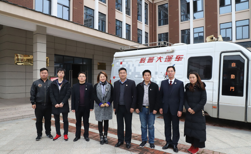 阳新一中校长明道树(右四)、副校长梁师稳(右二)等人与黄石科技馆科技工作志愿者合影