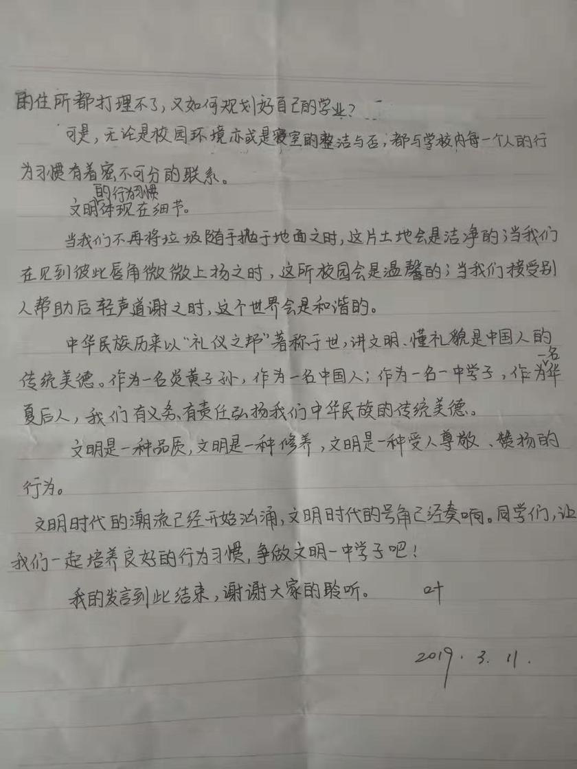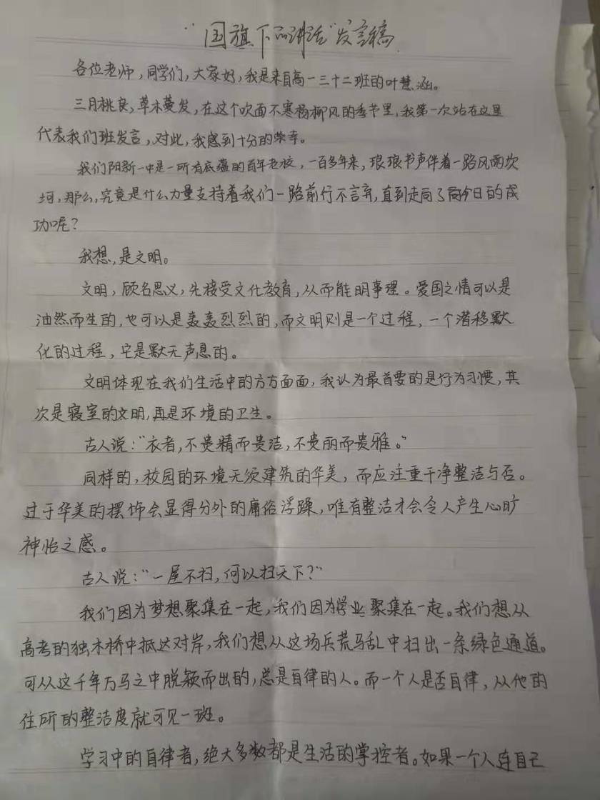 2019311日早上7:00,春意盎然,在雄壮的国歌声中,五星红旗冉冉升起,阳新一中老校区高一年级在运动场开展“国旗下的讲话”的活动,活动主题为“创全国文明校园,做文明守纪一中人”。阳新一中党委委员、副校长王能勇作了主题为“坚定目标求进步,良好习惯促成长”的讲话。年级组柯建中主任宣布了二月份年级量化考核优胜班级,年级领导给优胜班级颁奖。高一(32)班学生叶慧涵代表高一年级上台作了主题为“养成良好习惯,争做文明学子”的发言。高一312个班的全体学生和全体班主任积极参加了活动。活动由行政办主任、年级支部书记曾德东主持。(洪汉友供稿)