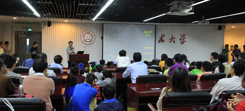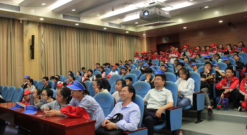 19日上午我们来到中科大东校区,先后参观了“光电子科学与技术学院”和“化学与材料学院”,观看和体验了光电实验和化学实验,上午其中重要活动是聆听专家讲座。中科大本次“科技活动周”特别安排了院士、知名教授做科普讲座,院士、教授这些科学大咖们,我们平时只能在电视里、网络上听闻知晓,此次研学活动,我们有幸聆听到工程科学学院党委书记、博士生导师褚家如教授的讲座,褚教授讲座的主题是《仰望星空——精密天文仪器及技术》,整个报告厅爆满,很多人都是席地而坐,褚教授从浩瀚的宇宙、奇妙的星空引入,讲到银河系的行星,讲到浩瀚宇宙的未知秘密,讲到研究天文仪器的发展,也讲到中科大的研究与成就。时而与同学们互动,科普天文知识;时而用简单的比喻解说深奥的道理,深入浅出。褚教授平易近人、和蔼可亲给在座的每一个人留下了深刻印象,在同学们心中种下科学的种子。
