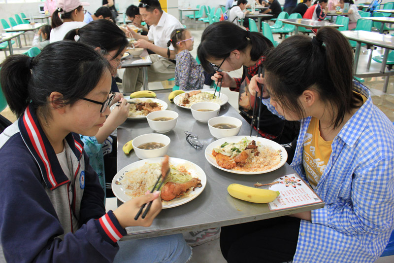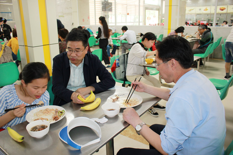 校长明道树(中间)、副校长梁师稳与学生一起共用午餐