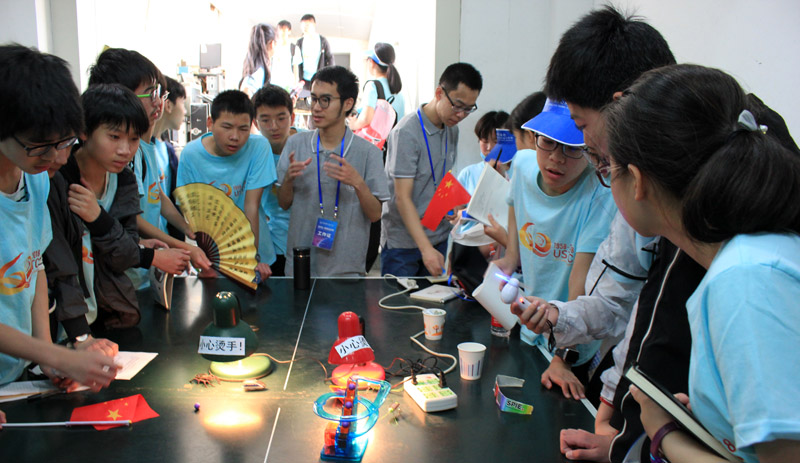 中科大分为东校区、西校区、中校区三个校区,校园环境优美,树木成荫,绿草如茵,鸟语花香,水杉林幽美恬静,枇杷林果实金黄,石榴树花朵耀眼,郭沫若广场庄严、严济慈广场灵动,彰显着厚重人文气息,掩映在古木参天的建筑更是显得古朴庄重。虽是暮春时节,没有初春的繁花似锦,也没有深秋的金黄满地,更没有隆冬的白雪皑皑,置身于此时的校园,却让人心旷神怡,正如同学们所感叹一样“这中科大真大!真美啊!”。这里最美的风景俨然是中科大的学长们,看,为我们引路的志愿者们文质彬彬;听,为我们讲解的研究生们知识渊博;瞧,在实验室里做实验的他们孜孜不倦。