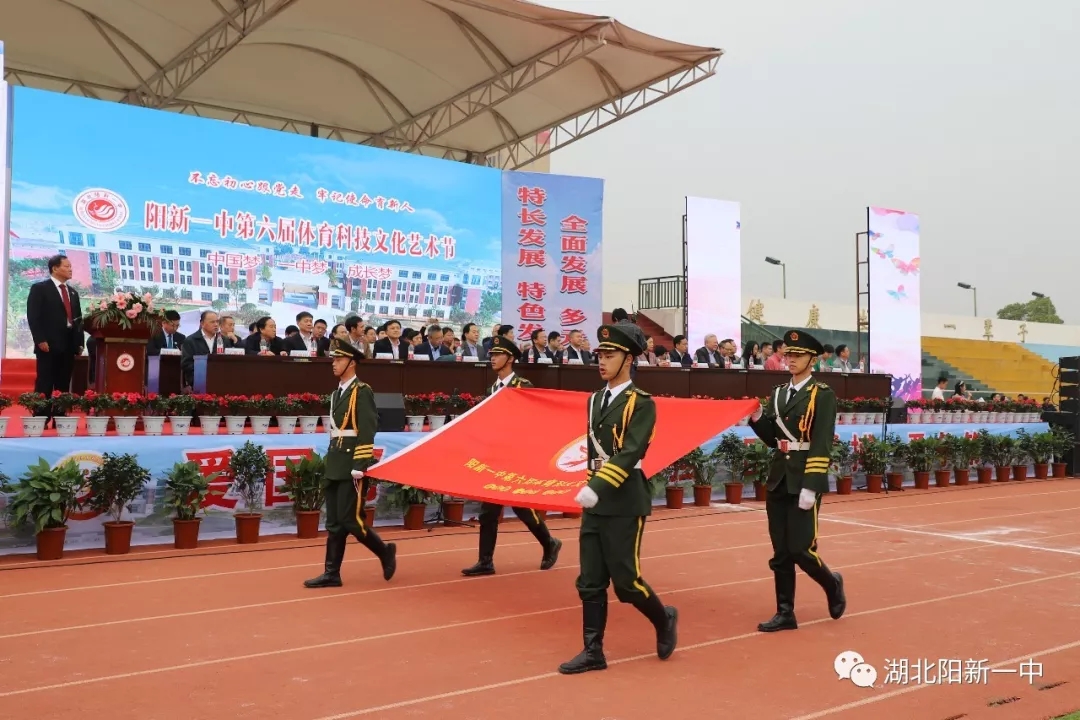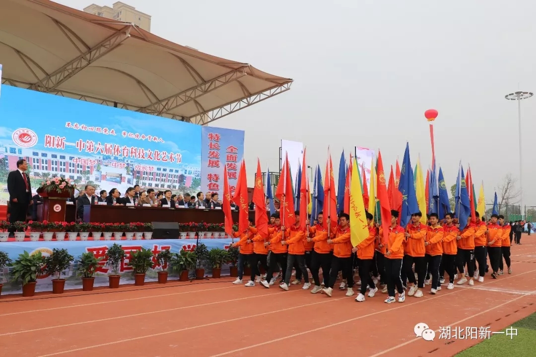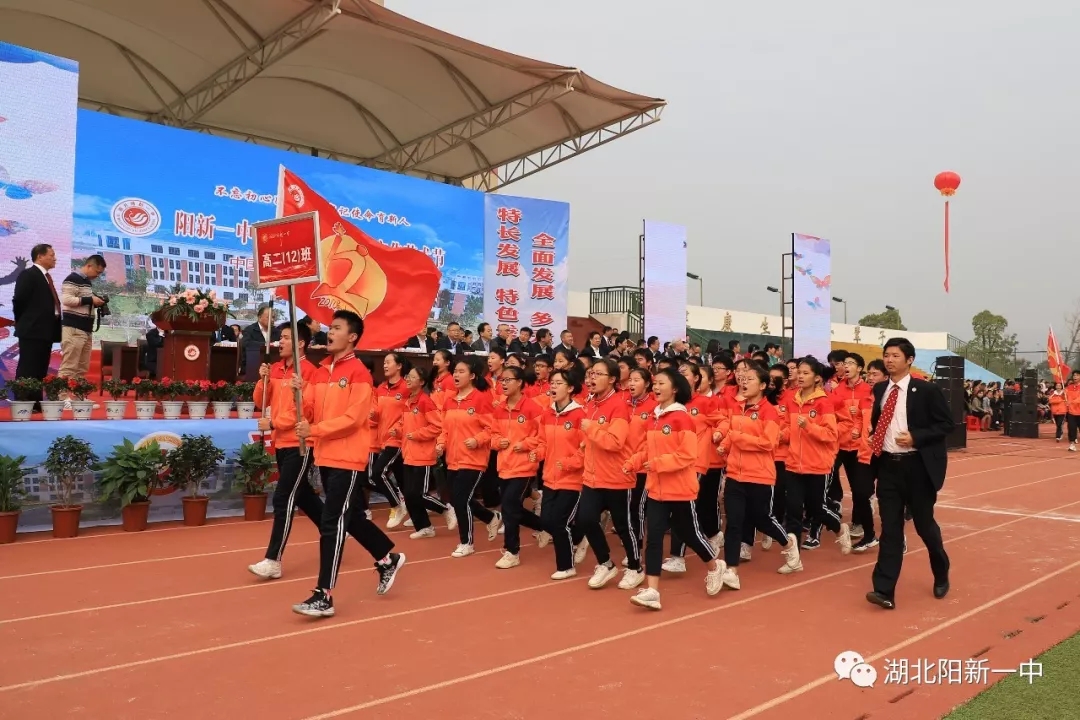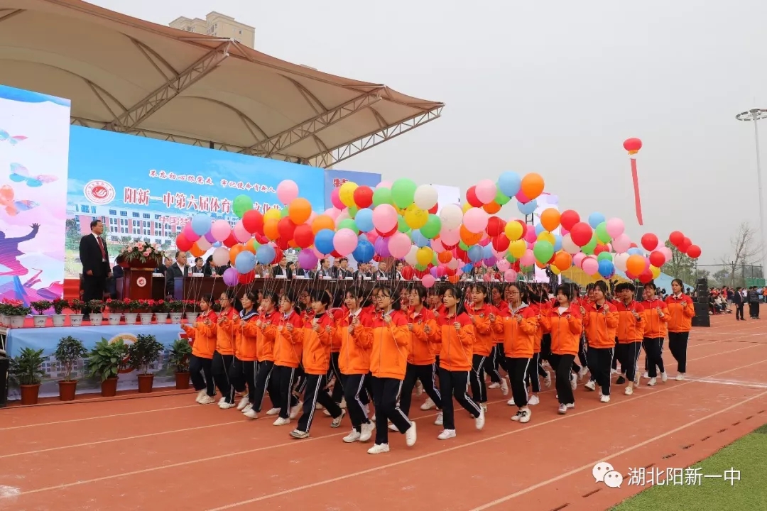 当天9时整,阳新一中新校区运动场鼓乐震天,新老校区全体师生汇聚在这里。国旗、五环旗、校旗、会旗、吉祥物、标语、彩旗、气球、志愿者、各级部方阵依次入场开幕式在庄严的升国旗仪式中拉开帷幕。
