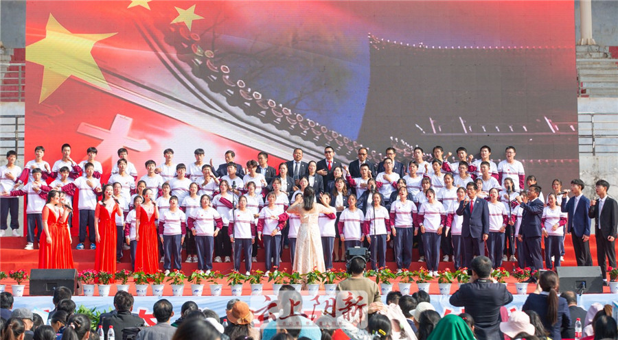 在雄壮的国歌声中,五星红旗冉冉升起。师生才艺表演隆重登场,精彩纷呈。激情的演唱、火热的舞蹈、强劲的大合唱、深情的经典诵读轮番上场。伴着舞台背景动态的画面,随着会场师生热烈的掌声,参演师生一次又一次把表演现场的气氛推向高潮。
