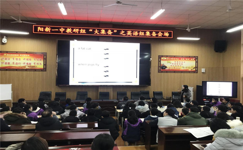 十冬腊月,寒气逼人,然而12月25日上午,明道楼学术报告厅里其乐融融的景象让人顿生暖意。为进一步推进教学改革,助力高三备考,打造教师队伍,实现教师共同成长,阳新一中教研组“大集备”之英语组第一次集备活动在这一天正式启动。副校长柯美宝、副校长李永红和新老一中所有英语教师出席了此次活动。活动由教研组长余艳主持。