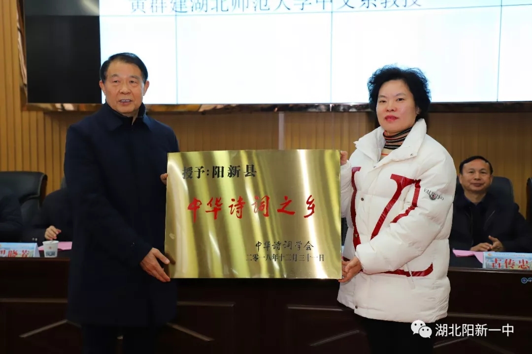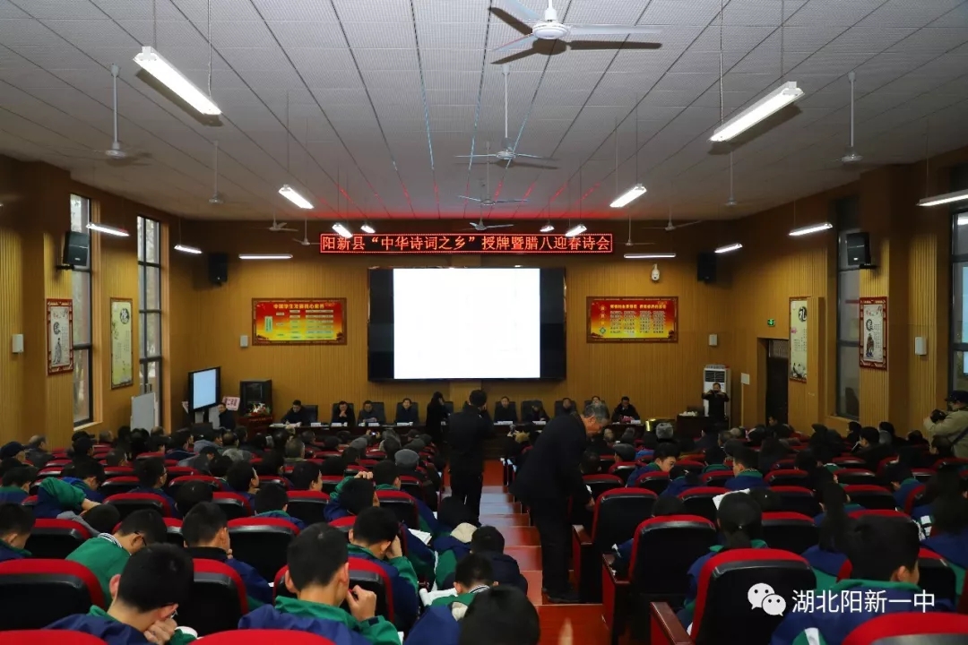 岁改旧历传春训,时值新年送好音。1月2日(腊月初八)上午,阳新县“中华诗词之乡”授牌暨阳新一中、富川诗社第十四届腊八迎春诗会在我校举行。省中华诗词学会会长黄金辉、省诗词学会副会长兼秘书长巴晓芳、黄石市诗联学会会长占传忠、西塞山诗社社长骆进益、名誉社长江祖桢、副会社长吴诗韵、黄移发、陈尚禄,县委常委、宣传部长、县总工会主席卢素琴和大冶市诗联学会、铁山区诗社、东方山诗词学会等诗友出席诗会。