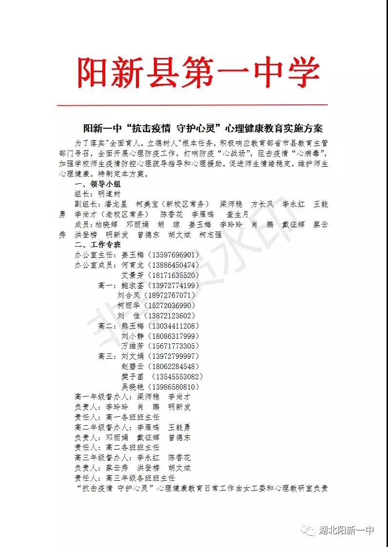 为了落实"全面育人,立德树人"根本任务,积极响应教育部省市县教育主管部门号召,全面开展心理防疫工作,打响防疫“心战场”,阻击疫情“心病毒”,阳新一中制定《阳新一中“抗击疫情 守护心灵”心理健康教育实施方案》。