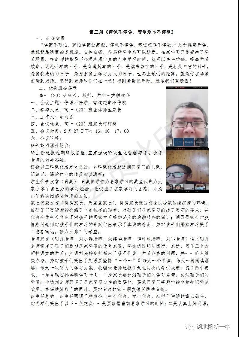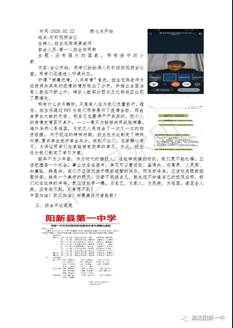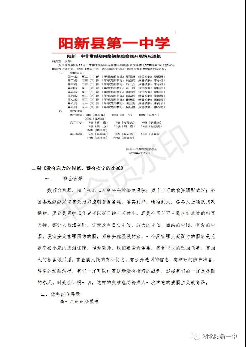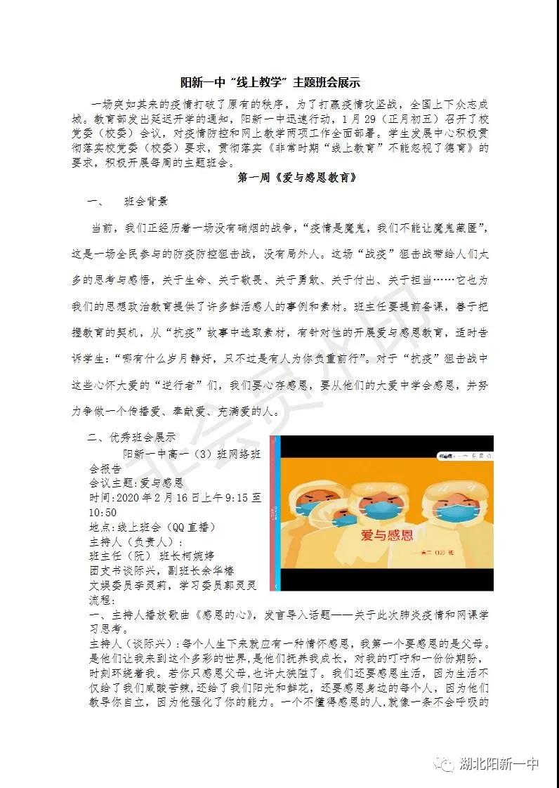 一场突如其来的疫情打破了原有的秩序,为了打赢疫情攻坚战,全国上下众志成城。教育部发出延迟开学的通知,阳新一中迅速行动,1月29(正月初五)召开了校党委(校委)会议,对疫情防控和网上教学两项工作全面部署。学生发展中心积极贯彻落实校党委(校委)要求,贯彻落实《非常时期“线上教育”不能忽视了德育》的要求,积极开展每周的主题班会,五育并举,立德在“线”。
