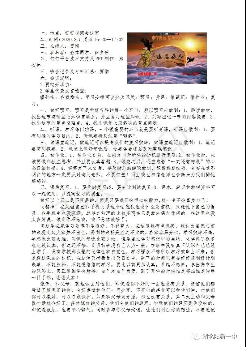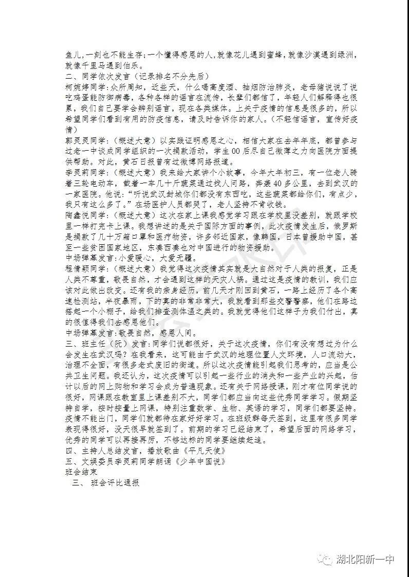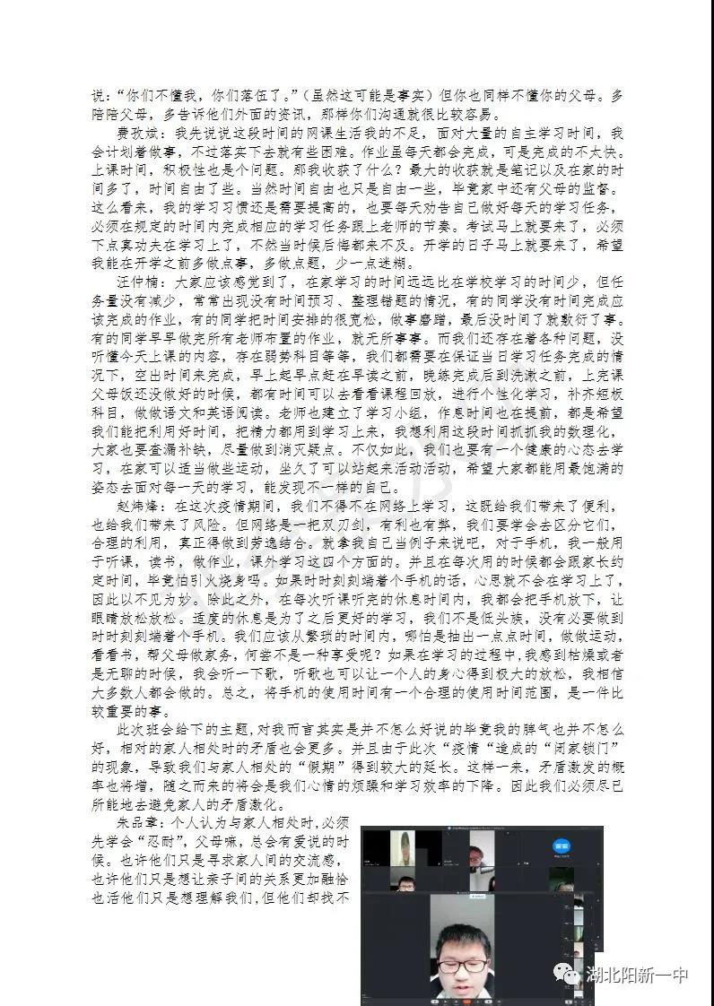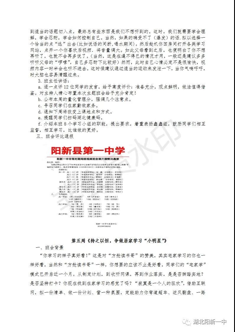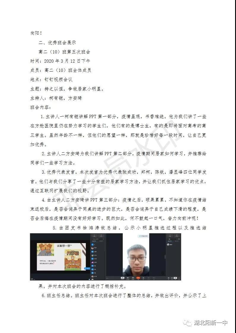 一场突如其来的疫情打破了原有的秩序,为了打赢疫情攻坚战,全国上下众志成城。教育部发出延迟开学的通知,阳新一中迅速行动,1月29(正月初五)召开了校党委(校委)会议,对疫情防控和网上教学两项工作全面部署。学生发展中心积极贯彻落实校党委(校委)要求,贯彻落实《非常时期“线上教育”不能忽视了德育》的要求,积极开展每周的主题班会,五育并举,立德在“线”。