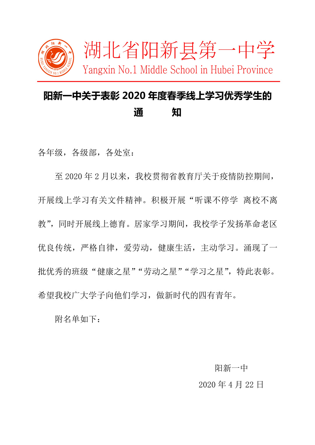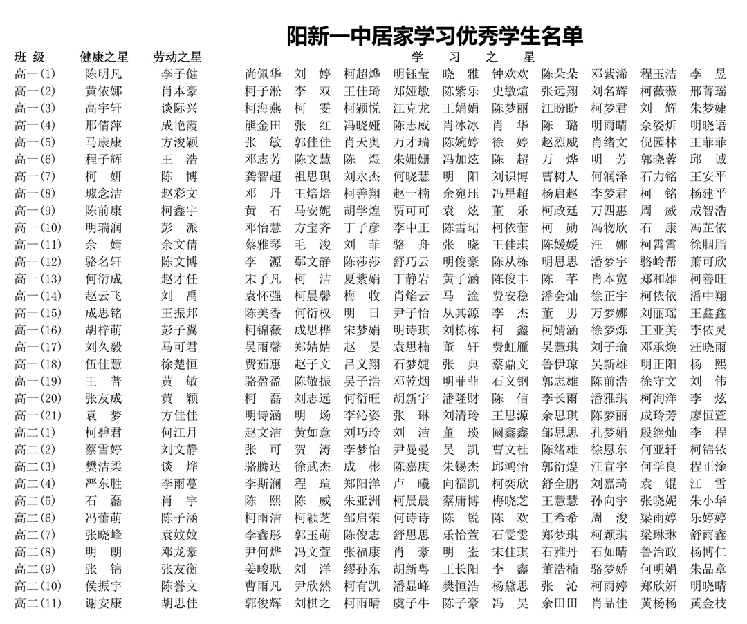 阳新一中关于表彰2020年度春季线上学习优秀学生的通知