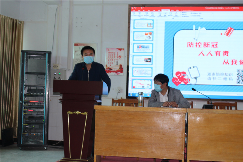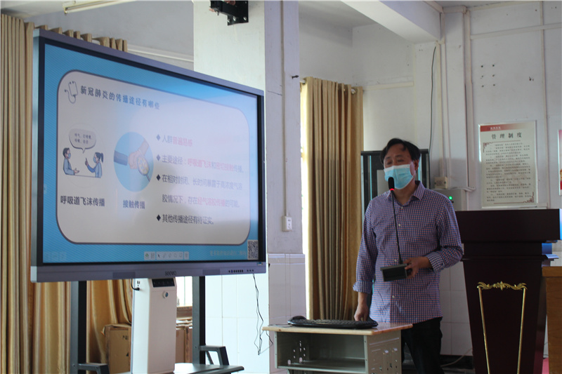 会议开始,县疾控中心陈少锋主任作疫情防控知识讲座,他从认识新冠肺炎、师生员工个人防护、学校防控管理和健康防护技能四个方面详细阐述了学校如何做好新冠肺炎疫情防控。