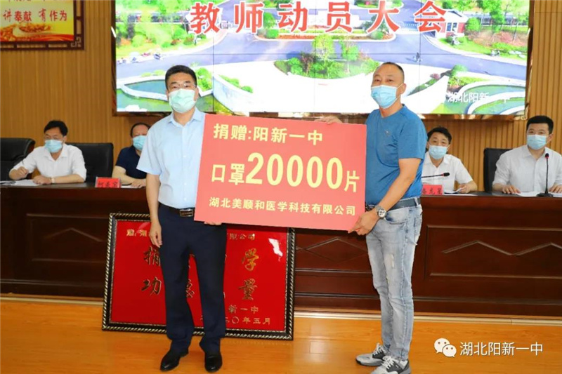 会上,湖北美顺和医药科技有限公司向我校捐赠了口罩20000只,用于我校疫情防控。公司董事长柯美顺表示,他还将一如既往支持学校各项工作。