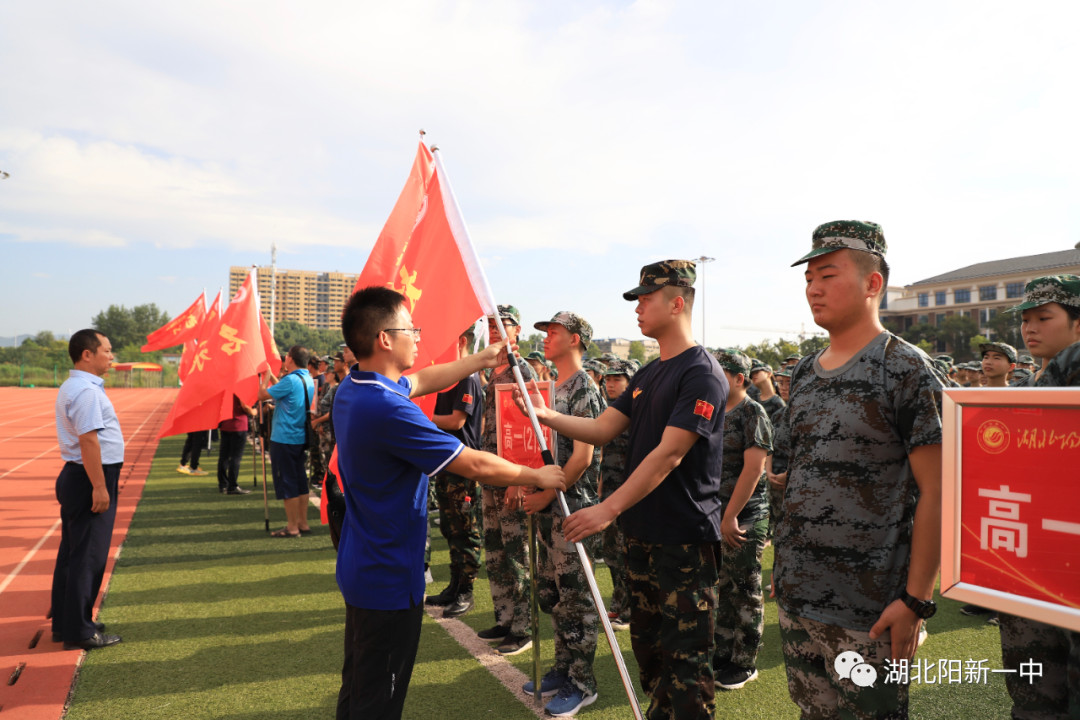 开营仪式在庄严的国歌声中拉开帷幕。首先高一年级22位班主任给各班教官进行了授旗。随后学校党委书记、校长明道树给高一同学们作了开营讲话,对2020级新生的到来表示热烈的欢迎,对参加军训指导的教官们表示崇高的敬意。他强调阳新一中是所百年老校,从儒学垴到莲花湖,从老城区到教育城,一路向东,传承千年儒学精神,砥砺前行、奋斗不止;他指出,2020年是不平凡的一年,新冠疫情蔓延,洪灾汛情不断,各位同学能够以优异的成绩考取阳新一中,正是学校“爱国好学、奋发图强、团结拼搏、勇争第一”学校精神的重要体现;他要求,同学们一要爱国,“天下虽安,忘战必危”,爱国是一个国家民族精神的集体体现,是每一个中国人的坚定信念和精神依靠,是每一个炎黄子孙义不容辞的义务与责任。二要能吃苦,吃苦是中国人的优秀品质,先苦其心志,始终保持饱满的热情和高昂的斗志出色的完成训练任务,方能增益其所不能,用汗水谱写人生新篇。三要有纪律,军训既要练体魄、技能,更要练精神,以高标准要求自己,养成严守纪律的好习惯,做到令行禁止。四要讲安全,安全问题无小事,军训操练不懈怠,要做好防护,防止中暑,身体不适等特殊情况提前报告,顺利完成任务;他希望,同学们英姿飒爽战骄阳,怀揣梦想有担当,青春似火竞风流,百炼成钢铸辉煌。