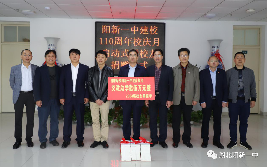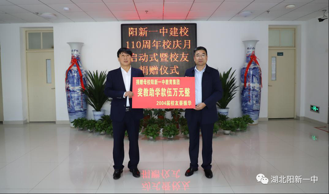 助学献爱心,真情寄母校。阳新一中教育集团2004届校友蔡振华委托其高中班主任李尚才副校长,向母校捐赠奖教助学款人民币五万元整。金太阳集团湖北区经理胡海兵代表金太阳集团向阳新一中捐赠前程似锦花瓶一对,书籍60余册。