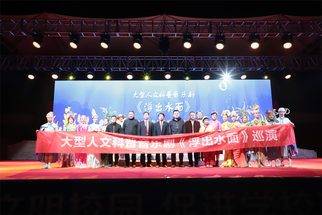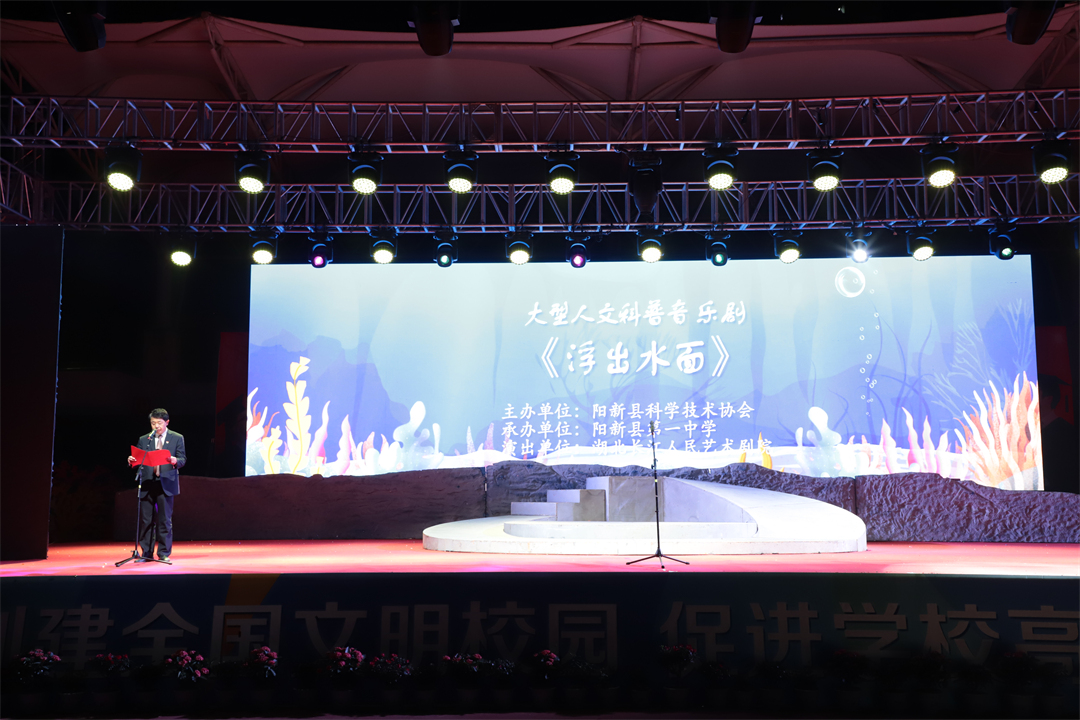 为深入贯彻落实《全民科学素质行动计划纲要》,弘扬科学精神、营造科学氛围、提高师生科学素养,助力学生健康成长,11月24日晚上,由阳新县科学技术协会主办、阳新县第一中学承办的大型人文科普音乐剧《浮出水面》活动在阳新一中田径运动场举行。活动由阳新一中党委副书记潘龙星主持,副县长程航致词。县科协主席章松涛、副主席方文胜,县全民科学素质工作领导小组成员单位相关人员,阳新一中校委会全体成员及全校4000余名师生及观看了演出。