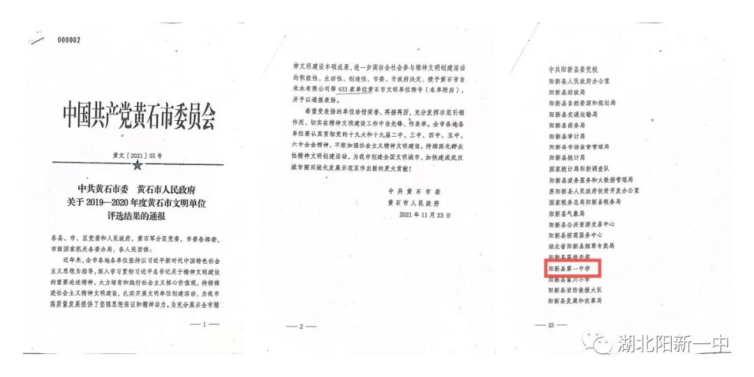 2021年,我校被黄石市委授予“文明单位”称号,此前,我校2017年度,2020年度被湖北省文明办授予“湖北省文明单位(校园)”称号。这些荣誉的取得既是上级部门对我校的肯定,也是对我校的鞭策。