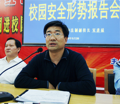 520,我校举行校园安全形势报告会。会议主会场设在综合楼学术报告厅,全校学生通过校园广播系统收听了报告会。报告会由政教室主任邓家宜主持,由我校特聘的“法制副校长”宋进禄同志主讲。学校党总支副书记、副校长明道树作了讲话。(图片拍摄 王有海)