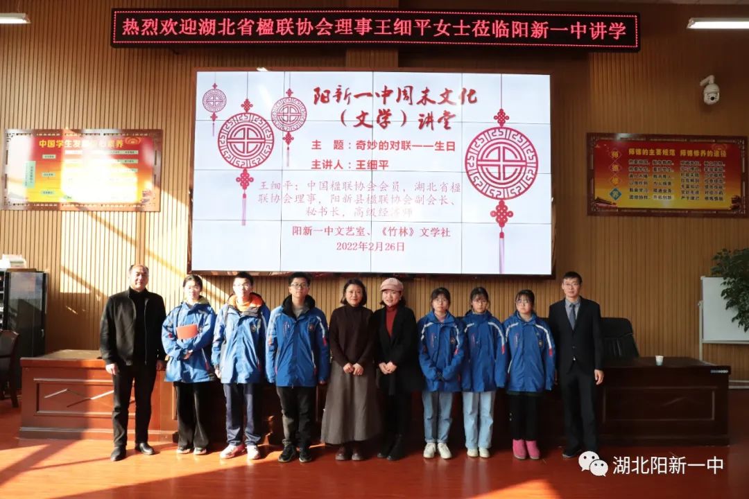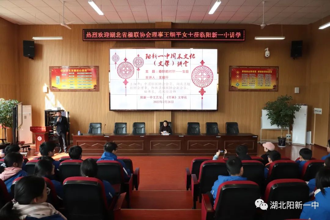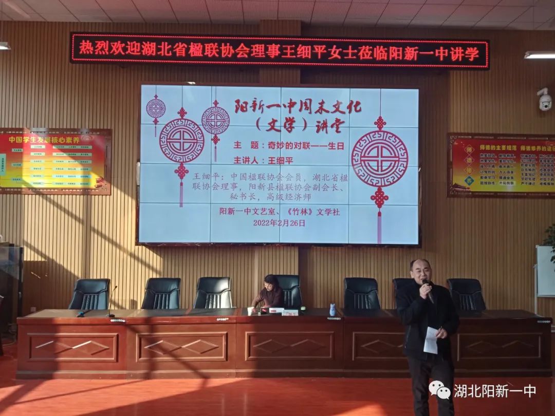 向阳草木青,明媚春光暖,春天的美,俯拾皆是,但尤爱诗词楹联里如画的春。为拓宽学生视野,传承优秀传统文化,提升学生文学素养,推进新高考背景下的“大语文”教学改革。26日,中国楹联学会会员、湖北省楹联学会常务理事,第五届莲华奖十佳联作获得者,2010、2011、2012年度中国对联创作奖获奖者,阳新一中校友王细平女士走进阳新一中“周末文化(文学)讲堂”作《奇妙的对联——生日》讲座。阳新县楹联学协会、阳新县作家协会部分会员及一中高一年级200余名学生聆听讲座。活动由阳新一中校刊《竹林》主编曹祥才老师主持,阳新一中校刊《竹林》副主编余秋桦老师作总结。