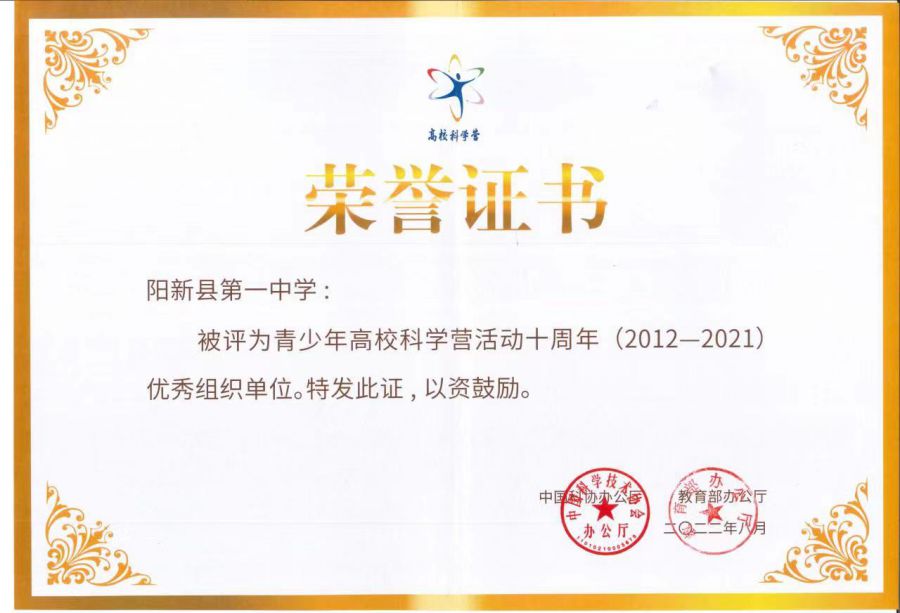 18日,阳新一中传来喜讯,在中国科协近日公布的青少年高校科学营十周年(2012-2021年)优秀组织单位和优秀科技工作者评选结果中,阳新一中被评为“青少年高校科学营活动十周年优秀组织单位”。湖北省仅有四所高中获此殊荣,该校是黄石市唯一获此殊荣的高中。这也是中国科协对黄石市十年以来培养科技创新人才方面所做工作的肯定和鼓励。