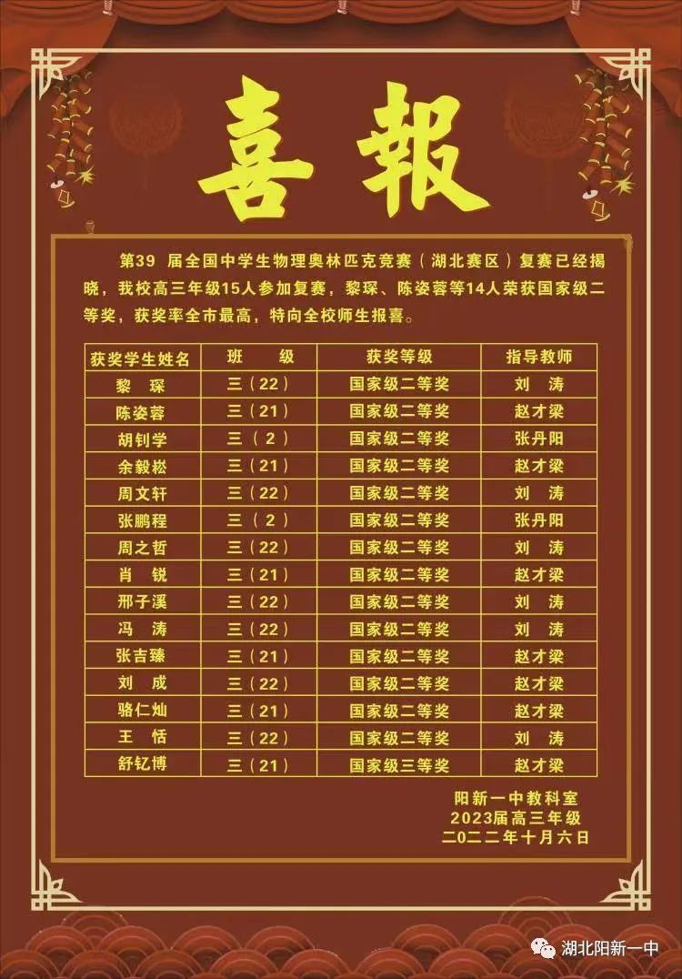 在2022年第39届全国中学生物理竞赛(复赛)湖北赛区中,阳新一中学子喜获佳绩!黎琛、陈姿蓉等14名同学荣获全国物理竞赛(复赛)二等奖,1名同学获全国物理竞赛(复赛)三等奖,参赛15人均有获奖。其中黎琛、陈姿蓉、胡钊学、余毅菘、周文轩等5名同学位列二等奖前100名;二等奖前200名阳新一中11人,二等奖层次阳新一中获奖率全市最高!